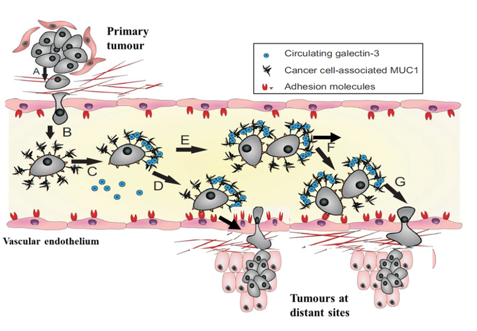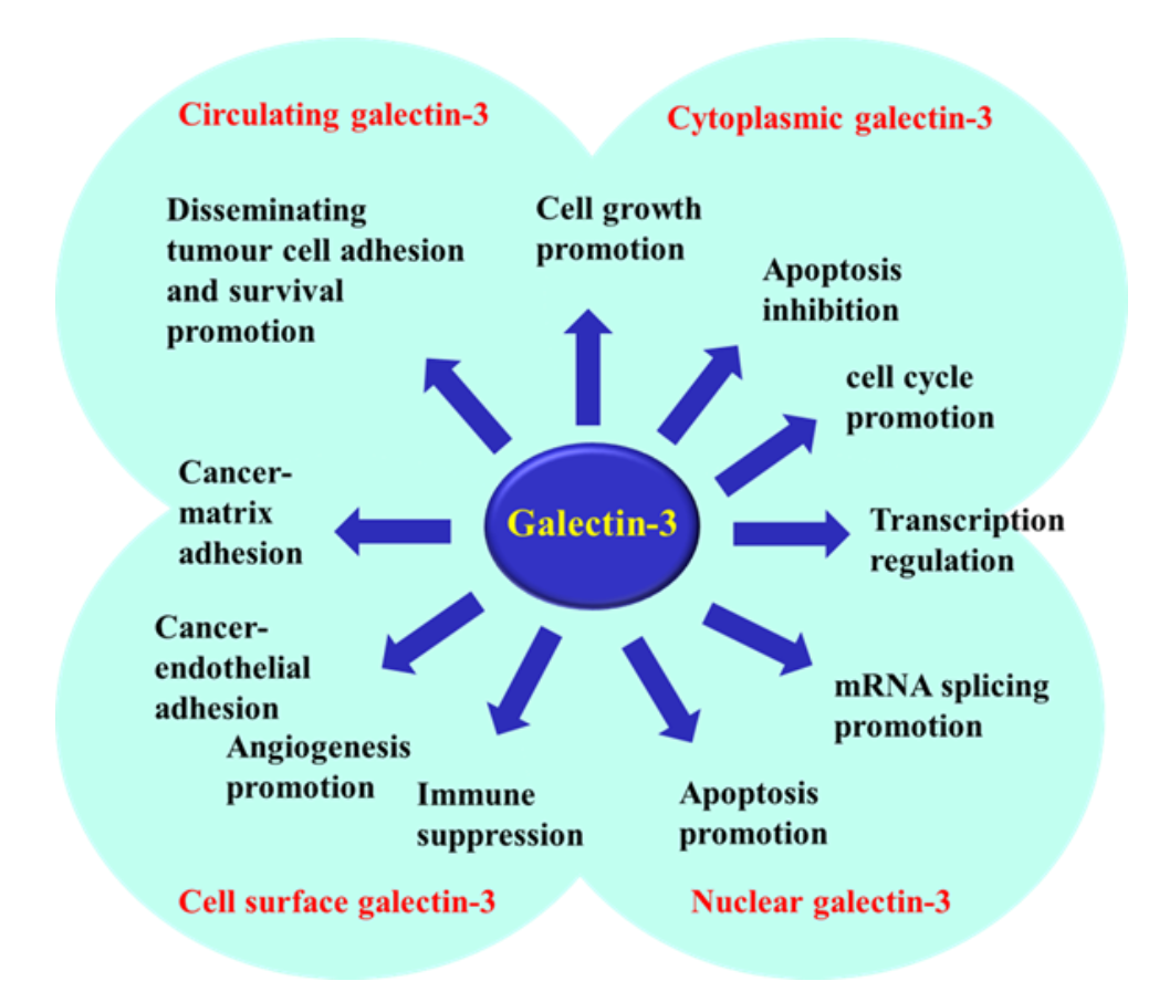 Over-expression/secretion of galectin-3 is a common feature in cancer and pre-cancerous conditions. More and more evidence has revealed that galectin-3 overexpression is an important promoter to several critical steps in cancer development, progression and metastasis, e.g. in tumour cell growth, adhesion, invasion, angiogenesis, immune suppression and spreading (Figures 1 and 2). Galectin-3 does so by multiple molecular mechanisms through binding of its well-defined carbohydrate-recognition domain to multiple galactoside-terminated cell surface glycans and also intracellular proteins.